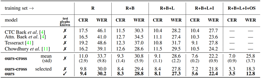 图3 VS-1、VS-2:泛化到具有/不具有已知测试字形和增加训练字体数量的新字体。FontSynth测试集上的错误率(以%为单位;数值越低说明模型效果更好)。Ours-cross代表交叉字体匹配,其中测试字形未知,训练字体被用作字形样本,当样本字体从训练集中随机选择时显示mean和standard-dev,selected显示基于置信度自动选择的最佳匹配示例的结果。R、B、L和I对应于FontSynth训练集中的Regular,Bold,Light,Italic;OS代表Omniglot-Seq数据集。