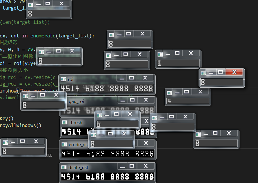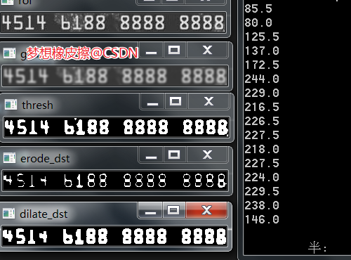 腐蚀之后在进行膨胀,让原有的数字区域变的明显,最后的图片是进行之后的效果,关于卷积核你可以自行调整。