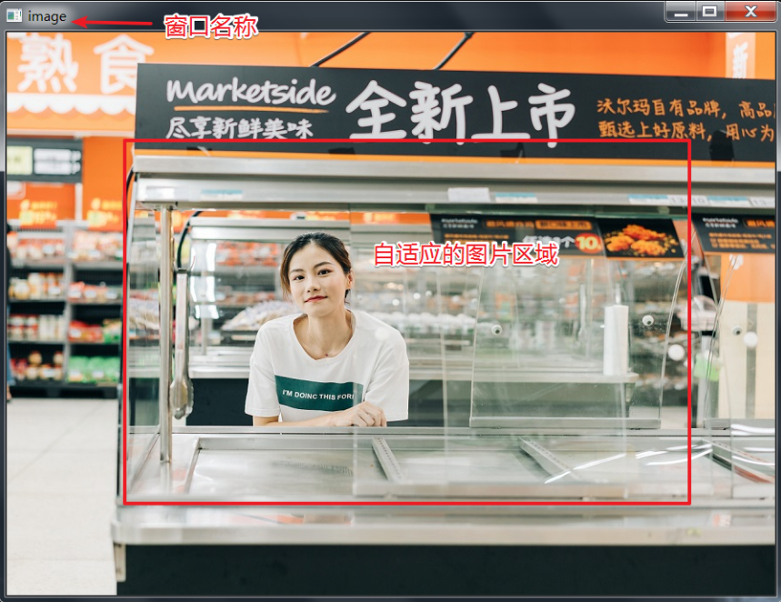 默认使用 cv2.imshow 函数即可显示图像,而且打开的窗口会自适应图片,该函数也包含两个参数,其一是窗口名字,注意不要使用中文,其二是图像。