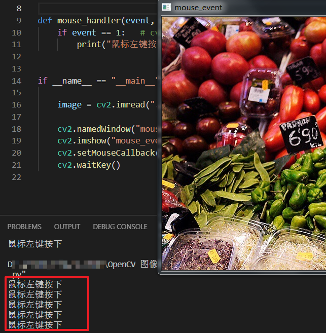 代码运行效果如下,在图片上点击鼠标左键,会在控制台进行数据的输入,输出内容如截图红框位置所示。