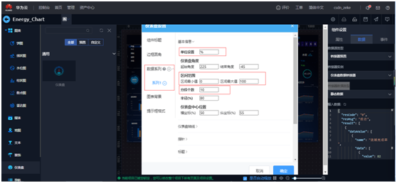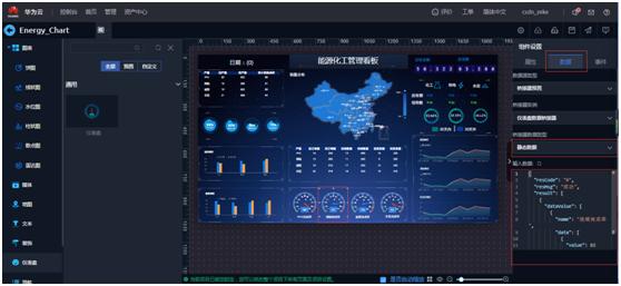 选中“仪表盘”,右侧组件设置点击“数据”,桥接器数据类型选择“静态数据”, 输入数据里面可以进行修改数据。