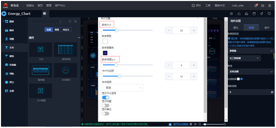 选中“翻牌器”,右侧组件设置点击“数据”, 数据源类型 选择“数据集”,数据集名称“化工销售额”,对应的“数值”选择一个数据字段(应收金额,应用额)进行数据绑定