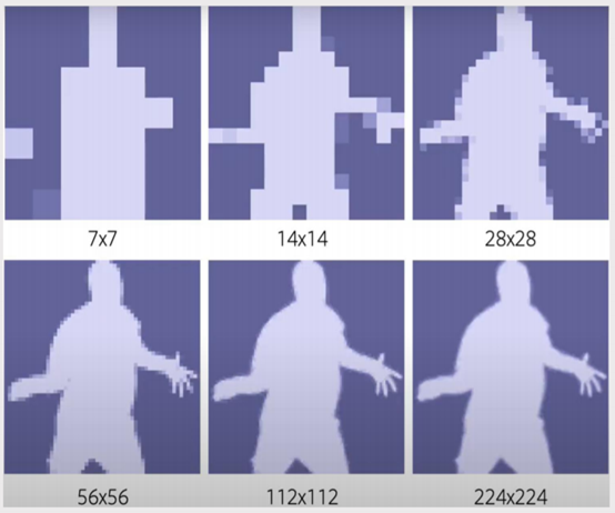 例如上图, 7×7的网格上身体中间的区域没必要使用太多的采样点。但是边界的区域,如果采样过于稀疏的话,最后会导致输出的边界过于平滑,不会很清晰。比如说手指采样的太少会导致分割出来的边界过于平滑,不太真实。但是为什么会使用这种7×7和那为什么如果要增加分辨率,然后是边界更加清晰的话,为什么不一直使用这224×224的网格?因为使用224×224的网格,虽然结果非常清晰,但是用到的显存要更大,计算速度要更慢。使用7×7的网格的话,输出计算速度最快,但是得到的mask非常模糊,缺少细节。