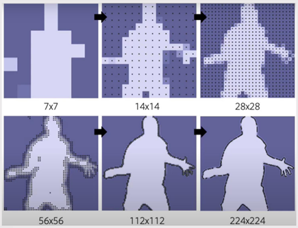 从图中可以看出,7×7的影像边界非常模糊,然后他逐渐上采样之后选择点通过选择点,然后选择这种边缘区域的点,高频的区域的点,最后的结果是224×240影像,这个边界就非常清晰。