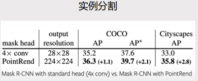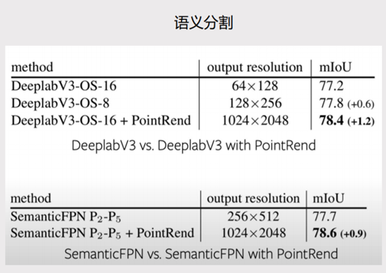 上图是语义分割的结果,Deeplab V3-OS引入PointRend模块之后,输出分辨率提高了,长宽各提高了16倍,mIoU提高了1.2,达到了78.4。SemanticFPN引入了PointRend模块之后,分辨率长宽各提高了4倍,mIoU提高了0.9,达到了78.6。