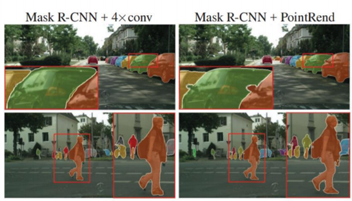 下图是Mask R-CNN加上4个卷积操作之后得到原始影像和Maskr加上PointRend模块之后得到的原始影像。可以看出这个分割的对象边缘更加丰富,不会导致过度平滑的问题。