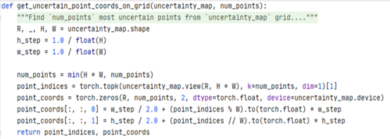 get_uncertain_point_coords_on_grid这个函数是用于得到不确定点。因为PointRend不会对输出网格上所有点进行预测,只会对部分不确定性较强的点进行预测。代码参考如下: