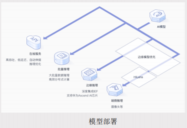 然后模型部署的话,在Modelarts上训练好的模型,通过模型管理和服务部署功能,可以快速发布在线推理服务,实现高吞吐、低延时支持多模型的灰度发布。同时支持批量的推理任务,处理大数大批量数据推理时,高效分布式计算Modelarts提供了模型优化能力,使模型更好的匹配边缘设备与华为的HiLens结合,可将模型轻松部署到摄像头等端测试设备快速进行应用开发。