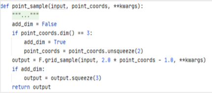 point_sample函数是根据点的位置来预测每个点的特征。就是通过一个差值操作来提供提取选中点的点集特征,并使用PointRendHead子网络根据组点特征来预测输出特征图。代码参考如下: