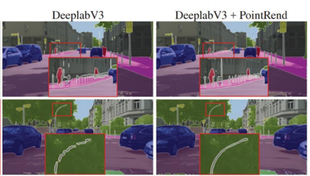 下图可以看出这个 DeeplabV3加上PointRend,边界不会导致过度平滑。