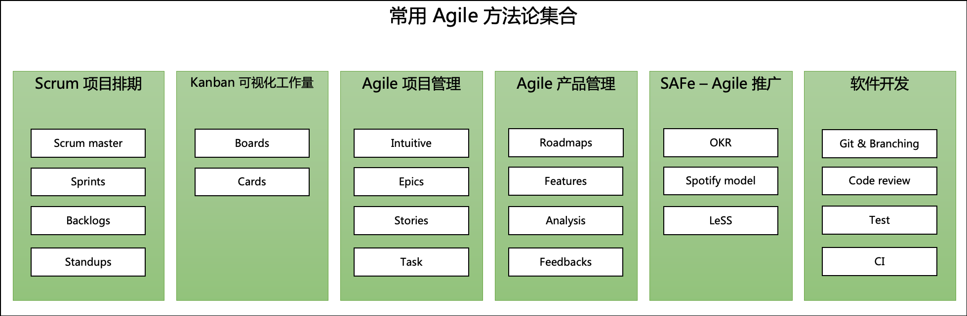 Agile 的方法论集合里,包含了项目排期,项目管理,产品管理,工作量评估,软件开发,个人绩效等方面。也有其他的一些,不过这里我们不细讲。