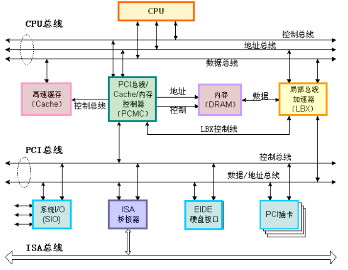 通过这些总线来连接内存、DMA、及高速、低速外设等。