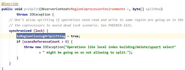 在region open时,需要加载phoenix cp(UngroupedAggregateRegionObserver),在该cp中存在一个标志位isRegionClosingOrSplitting,初始值为false,代表该region是否在关闭和分裂中。如果region分裂或者关闭时,会修改该值为true。如下图所示。