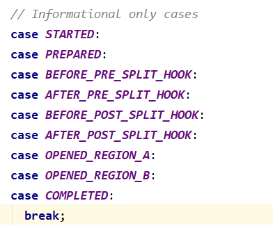 Split过程中通过JournalEntry保存着每一步的状态,用于回滚。根据报错日志,可以看出当前JournalEntry中保存的是AFTER_PRE_SPLIT_HOOK。而在回滚中,对于该状态是直接跳出的。