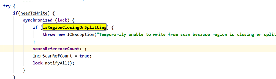 同时,如果有对region的scan操作,会先判断isRegionClosingOrSplitting值是否为true,如果为true,将报错。