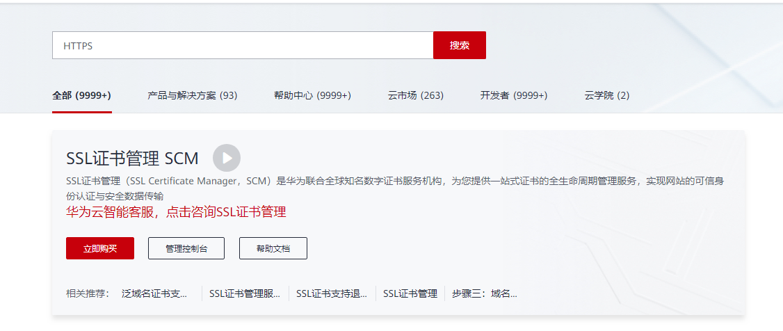 2:在华为云搜索HTTPS,看到了SSL正式管理SCM 这个服务,点击帮助文档。