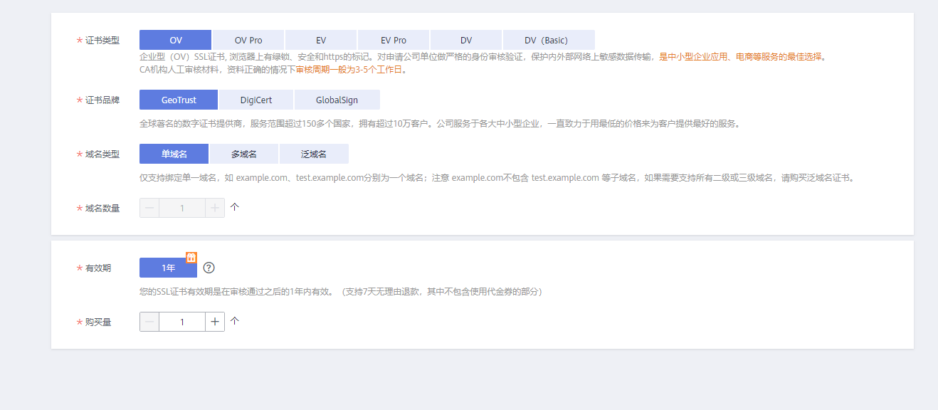 您可以针对不同的应用场景,灵活选择证书品牌、证书类型、域名类型。