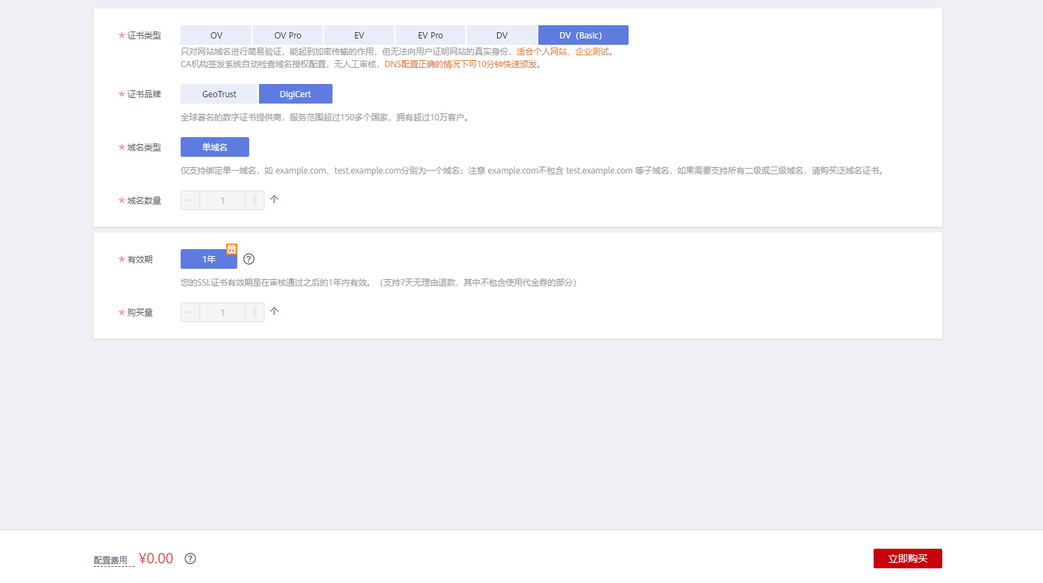 DV基础版证书提供有GeoTrust入门级SSL证书和DigiCert免费SSL证书。