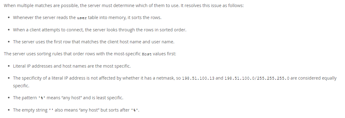 简而言之:MySQL 对于同一个User,会根据 Host 的匹配精度按降序排列,当客户端尝试登录 MySQL 的时候,会按照顺序依次这个 User下面所有的 Host 规则,采用最小匹配直到匹配成功。