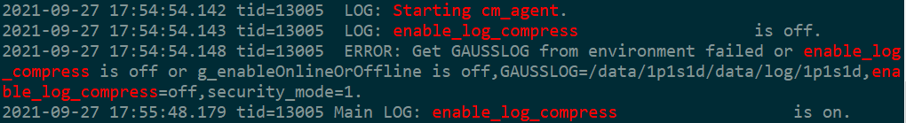 # 8.1 版本 gs_ssh -c "grep 'Starting thread LogCompress' $GAUSSLOG/cm/cm_agent/cm_agent*cur*.log" # 8.0 版本 gs_ssh -c "grep 'Get GAUSSLOG from env' $GAUSSLOG/cm/cm_agent/cm_agent*cur*.log" -