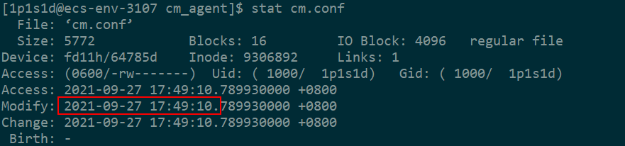使用 stat 命令查看配置文件最近修改时间