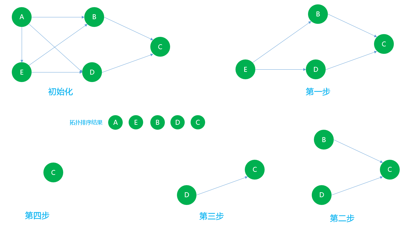 3. 重复执行上述两个步骤,直到所有的入度为0