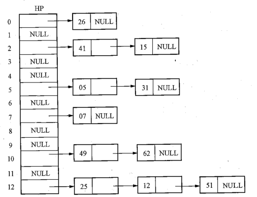 选定一个散列函数H(key) = key mod 13 ,键值为26,41,25,05,07,15,12,49,51,31,62