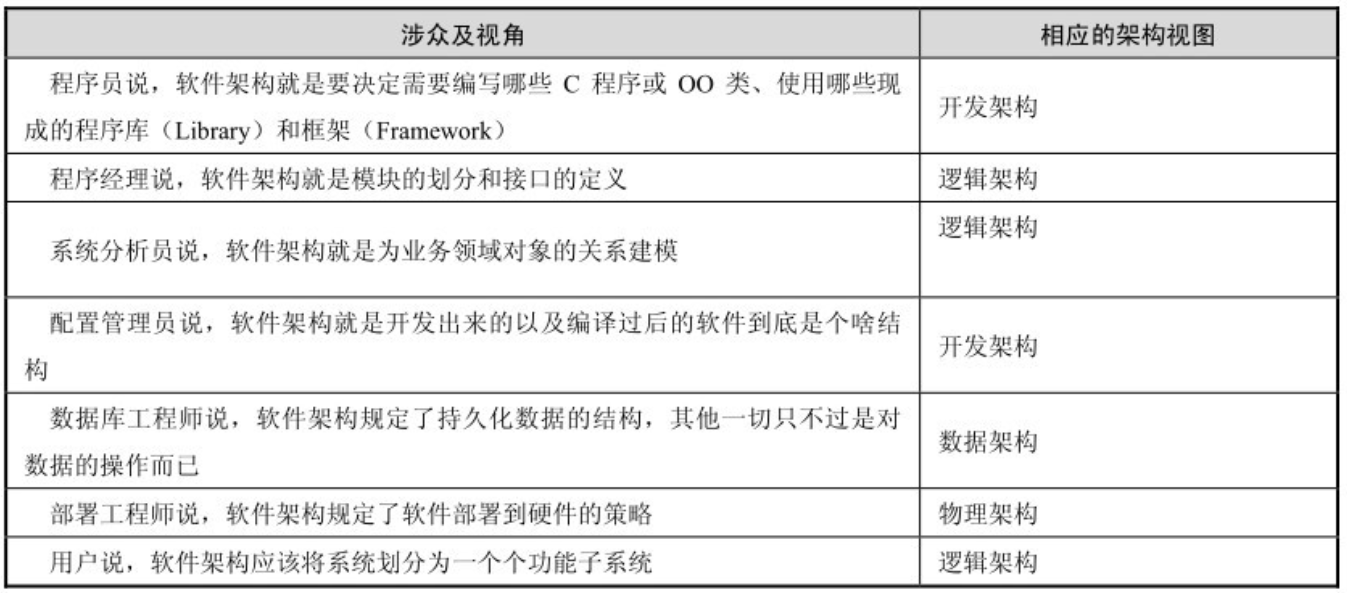 开发架构:开发架构关注程序包,不仅包括要编写的源程序,还包括可以直接使用的第三方SDK和现成框架、类库,以及开发的系统将运行于其上的系统软件或中间件。开发期质量属性。
