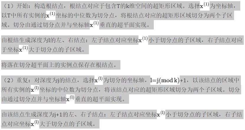 通常,依次选择坐标轴对空间切分,选择训练实例点在选定坐标轴上的中位数为切分点,这样得到的kd树是平衡的。但平衡的kd树搜索时的效率未必是最优的。