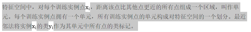 k近邻法中,当训练集、距离度量、k值及分类决策规则(如多数表决)确定后,对于任何一个新的输入实例,它所属的类唯一地确定。这相当于根据上述要素将特征空间划分为一些子空间,确定子空间里的每个点所属的类。