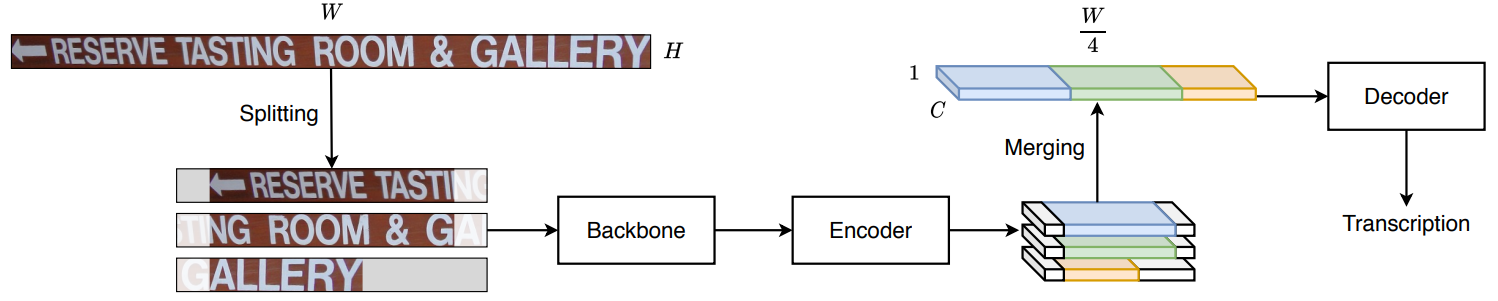 本文提出了一个简单而有效的分块策略,以确保模型在任意宽的输入图像上工作良好,而不会收缩(见图2)。本文将输入图像的大小调整为40像素高度,保留宽高比。然后,文本行被拆分为重叠的块,带有双向填充,以减少可能的边界效果(请注意,最后一个块有额外的填充,以确保用于批处理目的的统一形状)。本文将重叠的块馈送到主干和自注意力编码器中,以生成每个块的序列特征。最后将有效区域合并回一个完整的序列,删除填充区域。