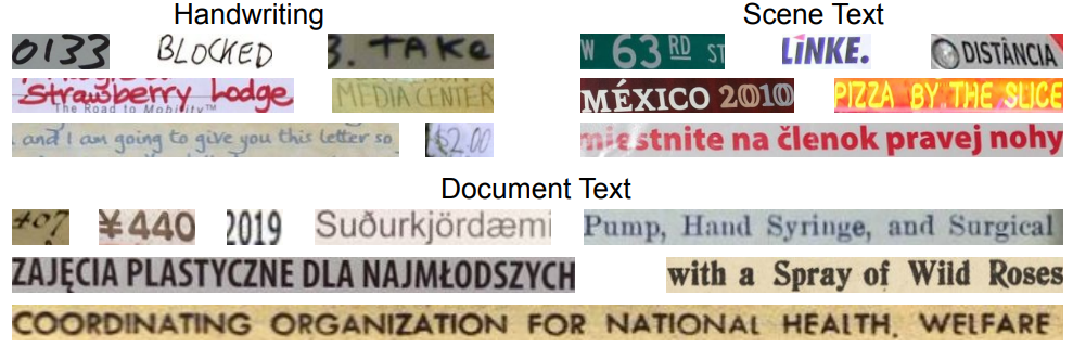图1 数据集中的文本行示例图像,其中包含各种长度的手写、场景文本和文档文本图像。