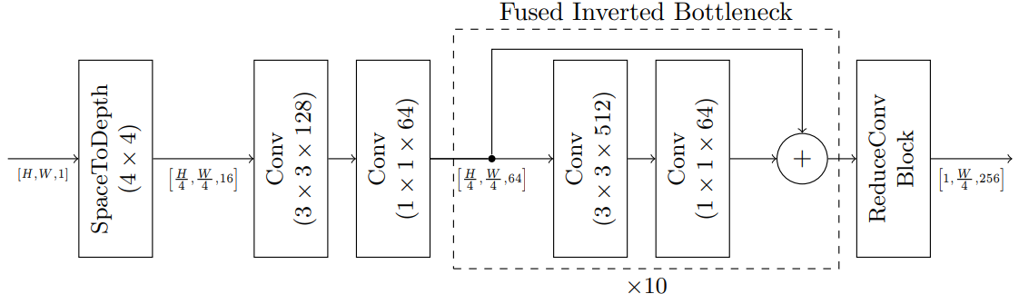 本文的主干是一个等距架构[6],使用融合反转瓶颈层作为构建块,这是反转瓶颈层[7]的变体,它用全卷积取代可分离的结构,以提高模型推理效率。等距架构在所有层中保持恒定的内部分辨率,允许低激活内存占用空间,并使模型更容易自定义到专用硬件,并实现最高利用率。图3详细说明了网络。它由一个块大小为4的space-to-depth层组成,然后是11个融合反转瓶颈层,具有3×3内核和8×扩展速率,具有64个输出通道。应用最终的完全卷积残差块将张量高度降低到1,作为输入送到编码器网络。
