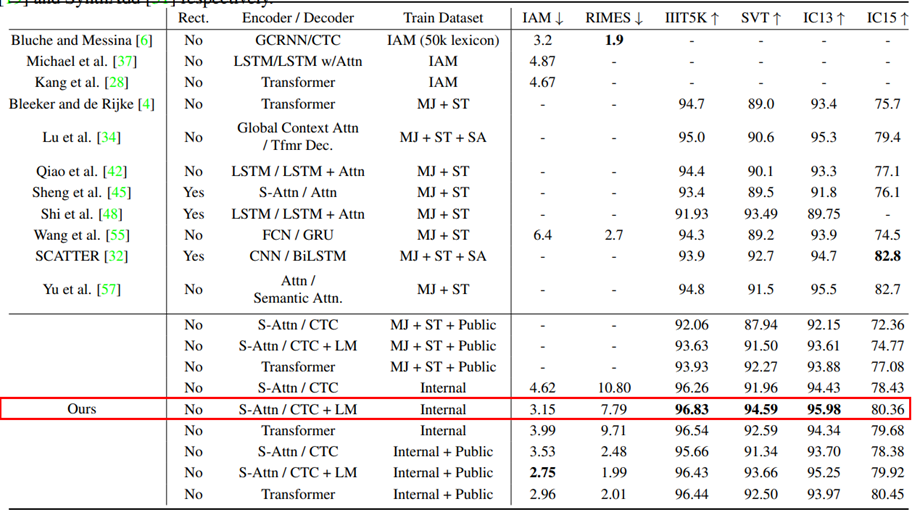 图4 对选择模型结构在手写数据集和场景文本数据集上的评估结果。“Rect.”列指示模型是否包括矫正模块。“S-Attn”、“Attn”和“Tfmr Dec.”分别代表自我注意力机制、注意力机制和Transformer解码器。“MJ”,“ST”和“SA”分别代表MJSynth、SynthText 和SynthAdd数据集。