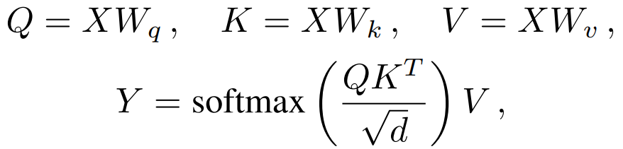 其中Q、K和V的三个参数W是大小为d×d的学习参数,它们分别将输入序列X投影到queries、keys和values中。编码特征Y是计算值V的凸组合,相似性矩阵由queries和keys的点积计算。