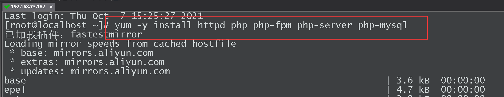 [root@localhost ~]# yum -y install httpd php php-fpm php-server php-mysql ##分别安装httpd php php-server php-fpm php-mysql等服务