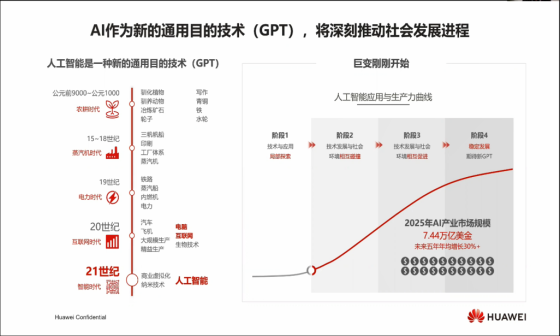 人工智能技术是IT和通信产业60年发展的总成果,它是一种新的通用目的技术,它将横跨整个经济的的多种用途,具有巨大的技术互补和溢出效应。“华为在实践中发现,人工智能不但可以替代人,还能够自动降低生产成本,这是人工智能与信息化最大的不同,也是其最有价值的特点。”AI不仅可以帮助人们以更高的效率解决已经解决的问题,也可以解决很多没有解决的问题。