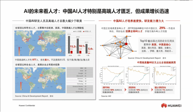 中国发展人工智能有四大优势:政策优势、海量数据资源优势、应用场景优势和青年人才优势。而且中国正在培养更多Al人才:2019顶级Al峰会中的中国论文,29%—作是本科生,同时也在招募全球AI人才,并吸引海外Al人才回国,在前十输出国之间的论文引用关系网中美国、中国是核心,英国、澳大利亚、德国、加拿大、法国、伊朗、意大利、西班牙...中国的高质量AI论文占比已全面超越美国!