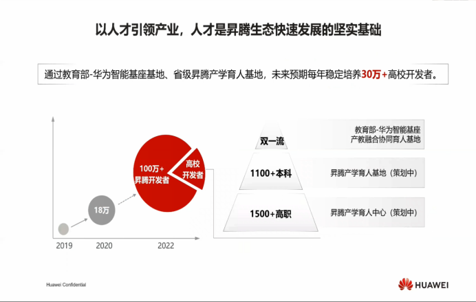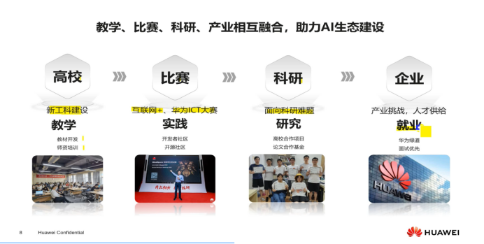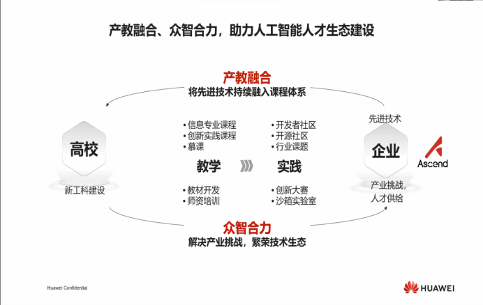 华为与教育部合作,共同成立“智能基座”产教融合协同育人基地;以鲲鹏、昇腾和华为云为技术底座,建立高校人才培养体系,通过产学研协同为计算产业推广及高质量发展奠定人才基础……