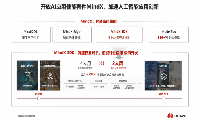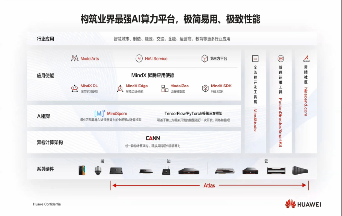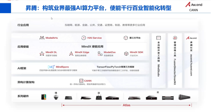 华为基于昇腾基础软硬件平台,包括昇腾处理器、Atlas系列硬件、异构计算架构CANN(音同CAN)、AI框架MindSpore及AI应用使能ModelArts等,已初步构建了一个完整的人工智能产业生态。