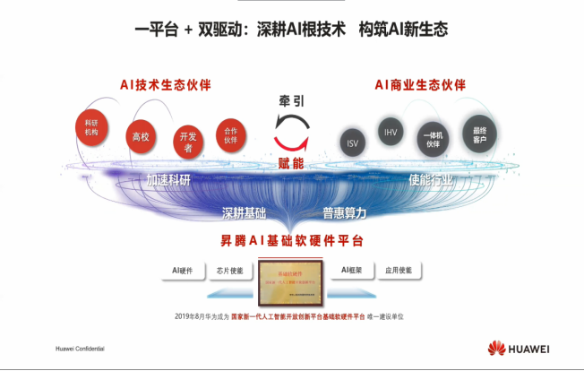 为此,华为打造了一平台+双驱动的AI产业布局,深耕AI根技术,构筑AI新生态。一方面,华为构筑AI技术生态,另一方面,培养AI商业生态,最终实现AI行业牵引与赋能的商业正循环。