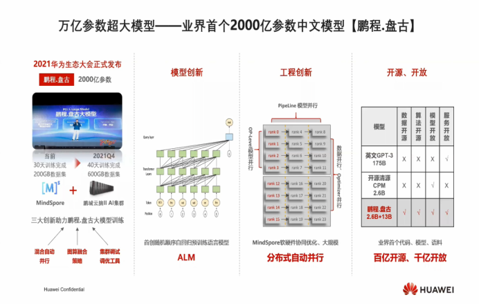 基于以上积累,华为今年发布的“鹏程·盘古”鹏城实验室超大模型,成为业界首个全开源 2000 亿参数中文预训练语言模型;华为云盘古大模型也达到1100亿参数,并涵盖自然语言处理(NLP)大模型,计算机视觉(CV)大模型,多模态大模型,科学计算大模型。
