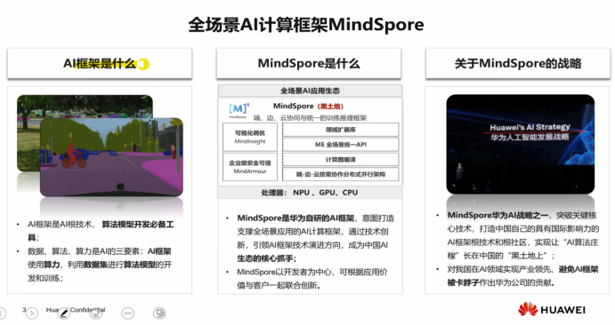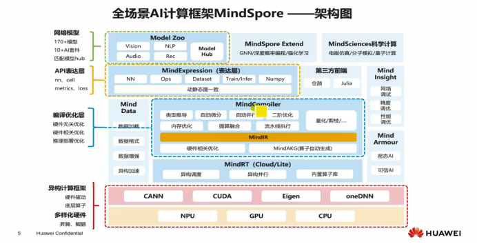 - MindSpore是华为自研的Al框架,意图打造支撑全场景应用的Al计算框架,通过技术创新.引领Al框架技术演进方向,成为中国Al生态的核心抓手;