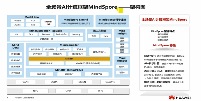 MindSpore采用端-边-云按需协作分布式架构、微分原生编程新范式以及AI Native新执行模式,实现更好的资源效率、安全可信,同时降低行业AI开发门槛、释放昇腾芯片算力,助力普惠AI。