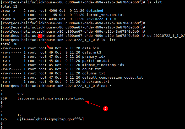从上面的图片可以发现,本地磁盘上的数据文件内容记录了obs上的对象名(uuid)和对象大小,它反映的是一种clickhouse本地数据文件和obs上对象之间的“映射关系”,注意这个“映射关系”是持久化在本地的,意味着需要冗余以满足可靠性;而obs上的数据文件名全是uuid。
