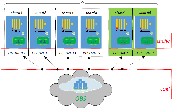 From bottom to top,我们再来看系统结构,离线加速场景中因为数据已经全部在对象存储obs上,数据不再需要备份冗余,所以可以去除对zookeeper的依赖,每个shard一个replica,充分释放每个节点上每个CPU核的计算能力: