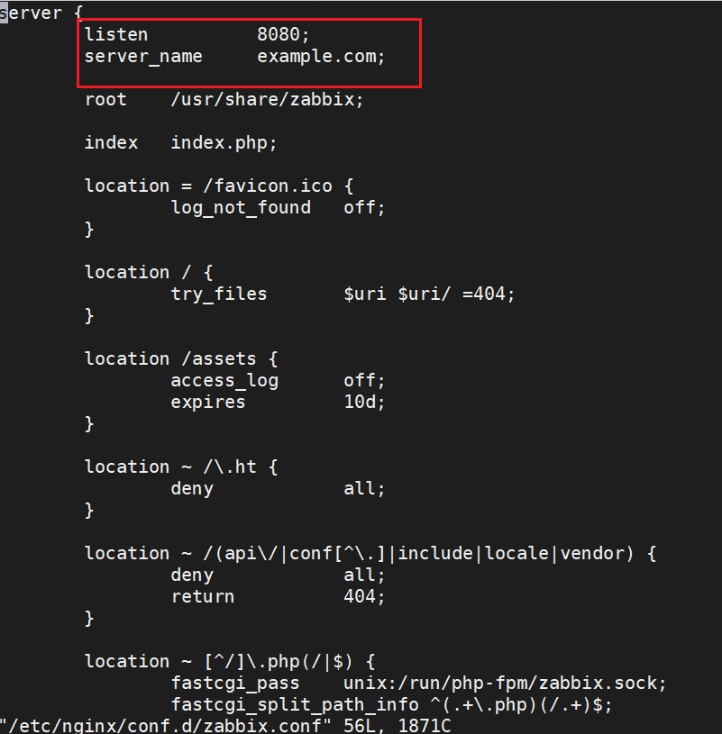 #取消注释并设置'listen'和'server_name',zabbix 使用 nginx 时不使用默认的80端口,如果使用默认80端口访问是显示nginx默认欢迎页,无法跳转至zabbix页面