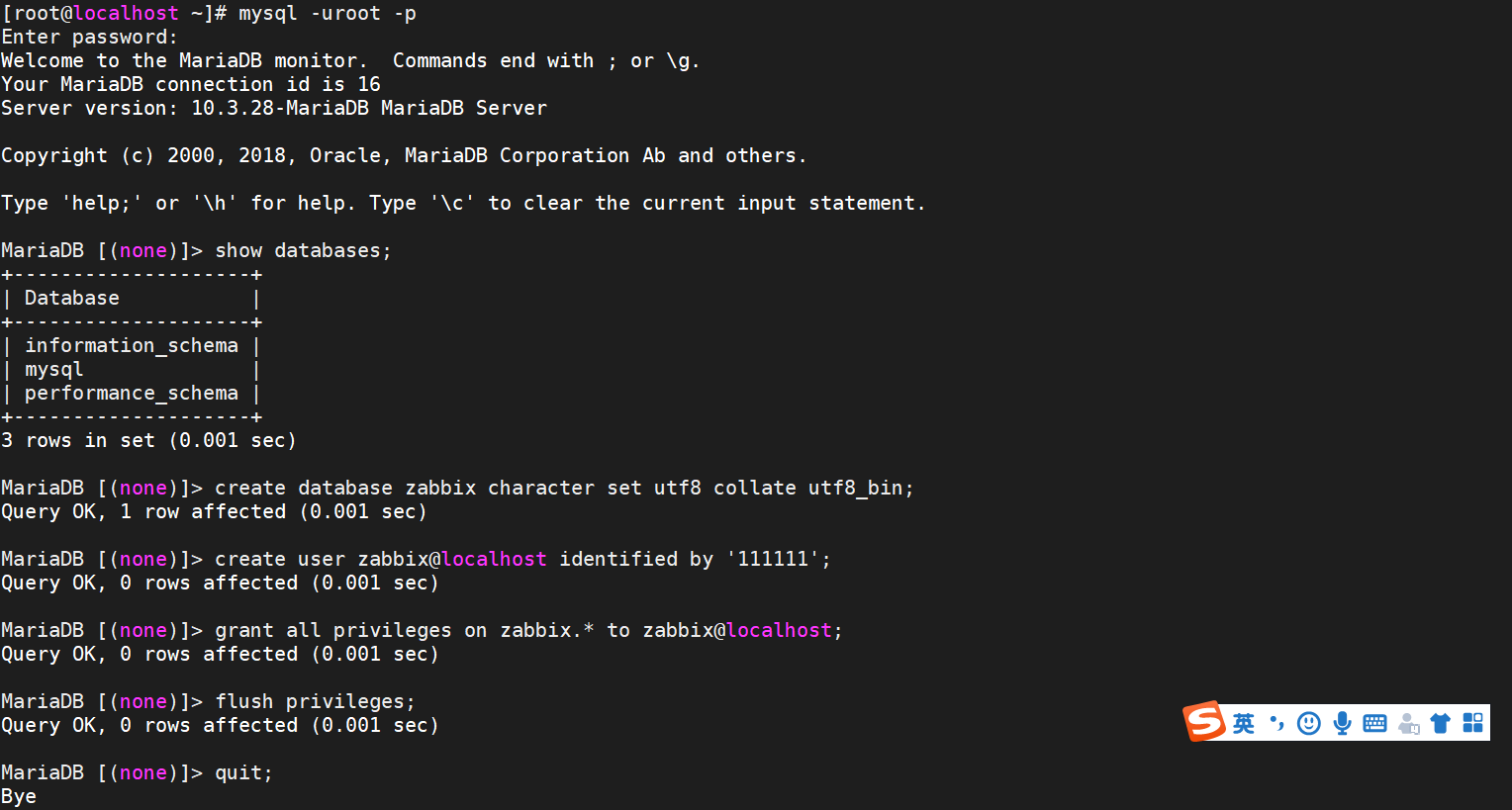 mysql> create user zabbix@localhost identified by 'password'; (密码可以自行修改)