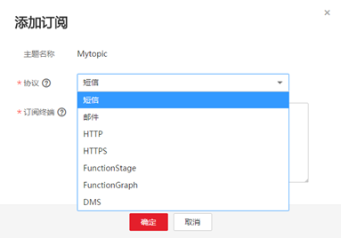 5. 在“协议”下拉框中选择订阅终端支持的协议,在“订阅终端”输入框中输入对应的订阅终端。批量添加订阅终端时,每个终端地址占一行。添加终端详情请参考消息通知服务用户指南的“添加订阅”。