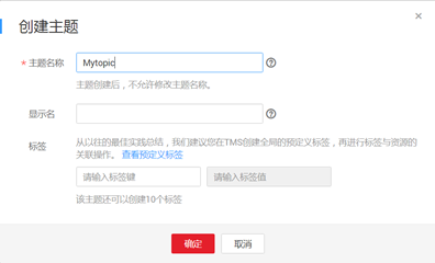 创建的主题名称,用户可自定义名称,规范如下: l 只能包含字母,数字,短横线(-)和下划线(_),且必须由大写字母、小写字母或数字开头。 l 名称长度限制在1-255字符之间。 l 主题名称为主题的唯一标识,一旦创建后不能再修改主题名称。 |